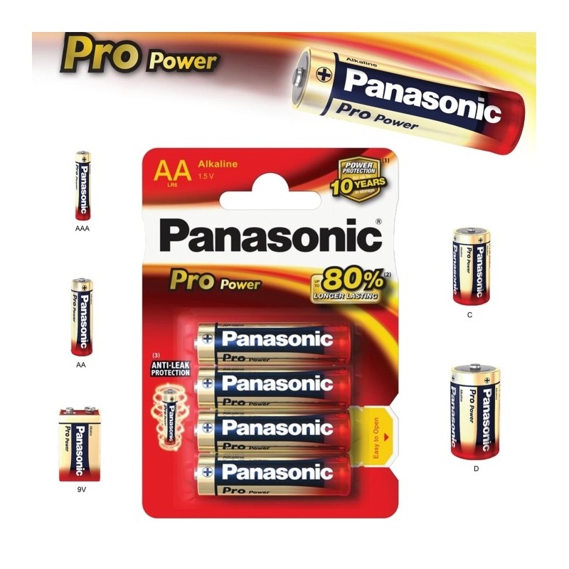 Řada vysokokapacitních alkalických baterií Panasonic Pro Power má až o 80% zvýšený výkon ve srovnání se standardními alkalickými bateriemi Panasonic. Je proto ideální pro použití v zařízeních se střední a vysokou energetickou náročností, kde je potřeba co největší výkon a výdrž baterií jako jsou například digitální fotoaparáty, přenosná rádia, hračky, svítilny, zubní kartáčky a další.