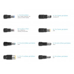 Univerzální nabíjecí adaptér pro notebooky AVACOM QuickTIP 150W dokáže se svými 8 různými konektory napájet většinu notebooků a herních notebooků oblíbených značek Acer, Asus, Compaq, Dell, Fujitsu/Siemens, Gateway, HP, LG, Lenovo, MSI, Packard Bell, Toshiba, eMachines i jiných zařízení, vyžadujících napájení ze sítě.