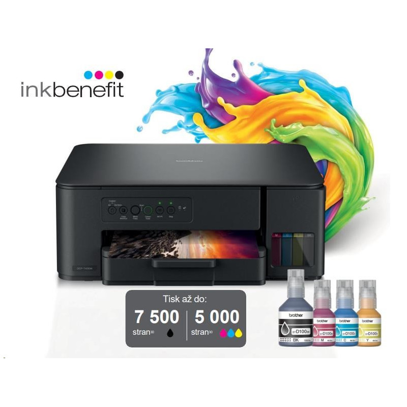 Kompaktná tlačiareň 3 v 1 DCP-T430W tlačí dlhšie s atramentovými fľaštičkami s super vysokou výťažnosťou, čo znižuje náklady na farebnú stránku. Rýchlo naplňte nádrže za niekoľko sekúnd, bez nutnosti držania fľaštičiek. Doplňovanie atramentu je jednoduché a bez rizika rozliatia. Inovatívny systém zámku fľaštičiek zabezpečuje, že vždy doplníte správnu farbu.