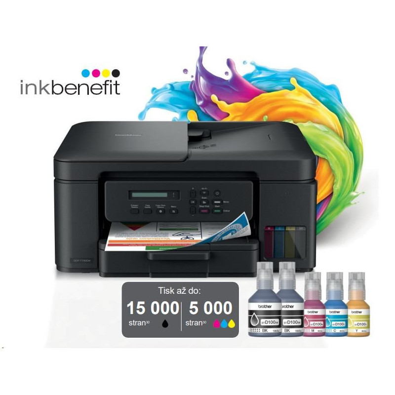 Kompaktná tlačiareň 3 v 1 DCP-T730DW tlačí dlhšie s inkoustovými fľaštičkami s super vysokou výťažnosťou, čím znižuje náklady na farebnú stránku. Rýchlo naplňte nádržky za niekoľko sekúnd bez potreby držania fľaštičiek. Dopĺňanie atramentu je jednoduché a bez rizika rozliatia. Inovatívny systém zámku fľaštičiek zabezpečuje, že vždy doplníte správnu farbu.
