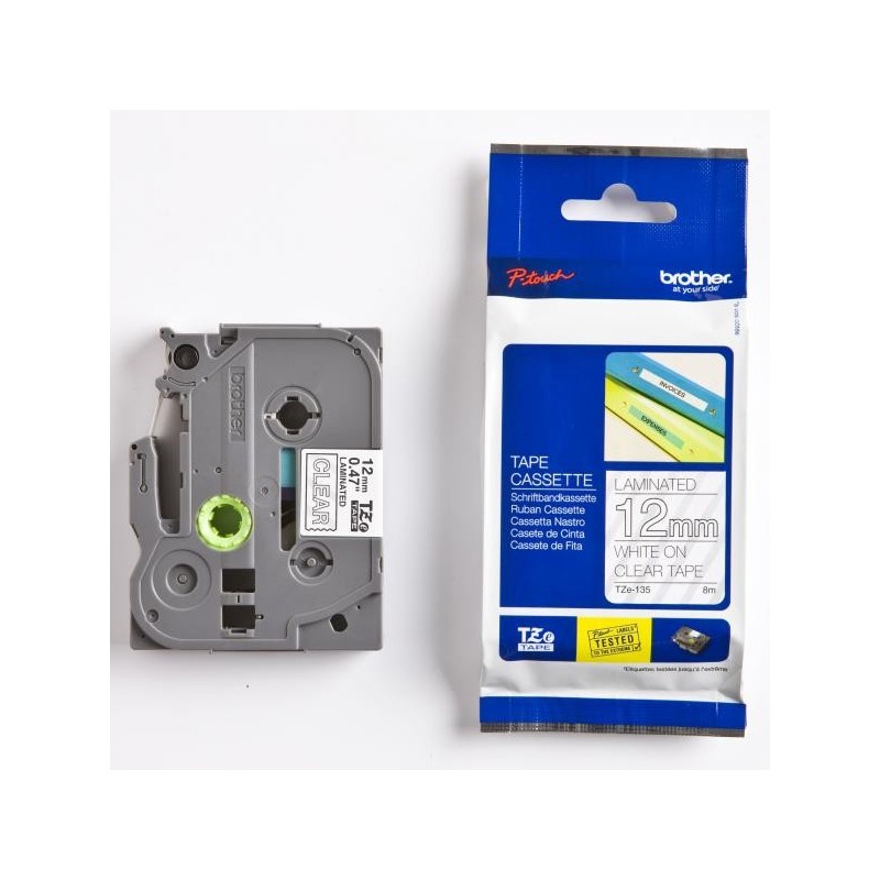 Brother originál páska do tlačiarne štítkov, Brother, TZE-135, biely tlač/priesvitný podklad, laminovaná, 8m, 12mm