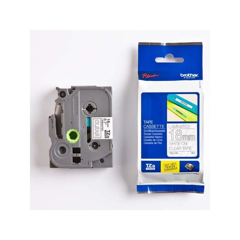 Brother originál páska do tlačiarne štítkov, Brother, TZE-145, biely tlač/priesvitný podklad, laminovaná, 8m, 18mm