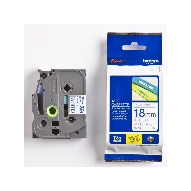 Brother originál páska do tlačiarne štítkov, Brother, TZE-243, modrý tlač/biely podklad, laminovaná, 8m, 18mm TZE243