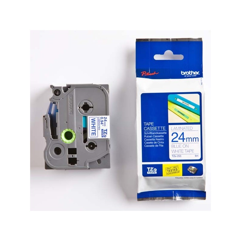 Brother originál páska do tlačiarne štítkov, Brother, TZE-253, modrý tlač/biely podklad, laminovaná, 8m, 24mm TZE253