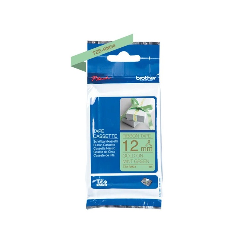 Brother originál páska do tlačiarne štítkov, Brother, TZE-RM34, zlatý tlač/zelený podklad, textilná, 4m, 12mm TZERM34
