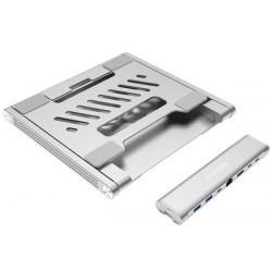Keď je čas vyraziť, skladací dizajn umožňuje jednoduché zbalenie a prenášanie. Magnetický, odnímateľný rozbočovač zároveň udržiava káble usporiadané a pracovný stôl bez neporiadku.