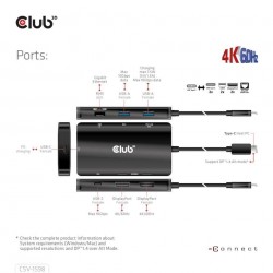 The Club 3D CSV-1598 is a 7-in-1 USB Gen2 Type-C to Dual Display Portable Dock with DP™1.4 Alt mode which provides most advanced, efficient solution to extend a single USB Type-C port to be multiple ports. It integrates video, data and power ports that allows to connect 2 DisplayPort™ 4k60Hz displays simultaneously for enjoying videos on big screen, connect multiple USB devices for data transmission , connect Ethernet source for getting PC to super high speed network. Besides, it has PD charging port which supports max 100W PD charging to support the function of the adapter and charge for the host simultaneously.It can work on all DP™ Alt mode supported USB Type-C host.