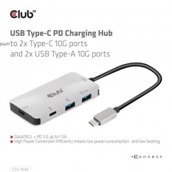 The Club 3D CSV-1543 is an USB Gen2 Type-C PD Charging Hub to 2x Type-C 10G ports and 2x USB Type-A 10G ports.The two USB Type-A ports are designed for transmitting data and one of the two USB Type-A ports can provide 1.5A charging for the connected USB Type-A devices (mobile phones, tablets, U-disk, etc). One of the two USB Type-C ports is designed for transmitting data and charging for the connected USB Type-C device, the other USB Type-C port supports both data and PD3.0 charging. It can work on any USB Type-C host (PC, notebook, tablet, Mobile phone, etc) that supports DP Alt mode.