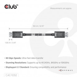 Kábel Club 3D CAC-1092 DisplayPort™ 2.1 umožňuje pripojenie vášho (herný) počítača alebo notebooku s podporou DisplayPort™ k monitora (Ultra) s vysokým rozlíšením alebo inému zariadeniu s podporou DisplayPort™. DisplayPort™ 2.1 UHBR10/13.5/20 až 80 Gb/s, má tiež podporu pre Display Stream Compression 1.2 (DSC), Forward Error Correction a rozširuje maximálny počet vložených audio kanálov na 32. Má uzamykateľné konektory DisplayPort™ zabezpečujúce bezpečné, spoľahlivé spojenie, s NOVÝMI kontaktnými prstami špeciálne navrhnutými pre tieto vysoké rýchlosti. Jednoducho stlačte zabudované jednodotykové tlačidlo na odomknutie konektora. Mäkký obal UltraFlex chráni kábel pred ohýbaním a poškodením deformáciami.