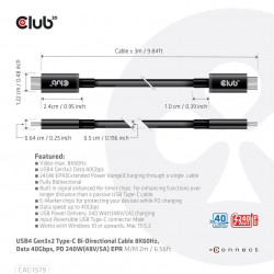Obousměrný kabel Club 3D CAC-1579 USB4 Gen3x2 Type-C 8K60Hz nebo 4K120Hz, Data 40Gbps, PD 240W(48V/5A) EPR M/M 3m / 9,84ft propojí váš notebook, tablet nebo telefon s výstupem USB4 Type-C k vašim oblíbeným stávajícím periferním zařízením, příslušenství a nabíječkám. Umožňuje video, data a napájení přes jediný kabel a oběma způsoby. Vestavěné čipy Re-timer s vylepšeným signálem pro vylepšení funkcí na delší vzdálenost než pasivní kabel USB Type-C, spolu s čipy E-marker na obou koncích kabelu poskytují tomuto kabelu podporu pro USB4 Gen3x2 Type-C Bi -Směrové video 8K60Hz nebo 4K120Hz, Data 40Gbps, PD 240W (48V/5A) EPR M/M na délku 3 m / 9,84 stop pro nabíjení nebo napájení vašeho notebooku, tabletu nebo smartphonu.