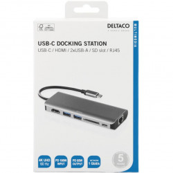 USB-C dokovacia stanica, 1x HDMI/RJ45/2x USB-A/SD - 4K UHD/ 60 Hz (3 840 x 2 160 pri 60 Hz), Kompatibilita: Plug and Play vyhovuje HDMI 2.0 HDCP 2.2 a HDCP 1.4, PD vstup: 100W, PD výstup: 85W, Pripojenia: USB-C samica, USB-C samec, HDMI samica, 2x USB-A samica, SD slot, RJ45 samica, Šírka pásma HDMI: 14,4 Gbit/s (kódované), Sieť: 1 Gbit/s
