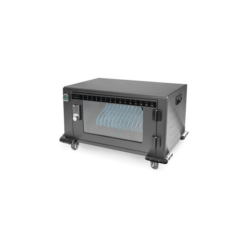 Mobilní nabíjecí skříň od DIGITUS® je ideálním a kompaktním řešením pro ukládání a nabíjení vašich přenosných zařízení, jako jsou notebooky a tablety. Mobilní nabíjecí skříně se často používají ve veřejných zařízeních, jako jsou školy, aby bylo možné bezpečně uložit zařízení na centrálním místě a zároveň je nabíjet. Součástí skříně je 16 nabíjecích stanic, z nichž všechny mají na přední straně vlastní USB připojení. Instalované ventilátory (24 V) kombinované s ventilačními štěrbinami zajišťují aktivní chlazení skříně.