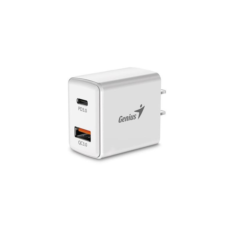 Genius PD-20AC, Napájecí adaptér, síťová nabíječka, 1× USB, 1× USB-C, výstup max. 3A, Quick Charge 3.0, Power Delivery 3.0, 20W, vstup 100–240V, bílá