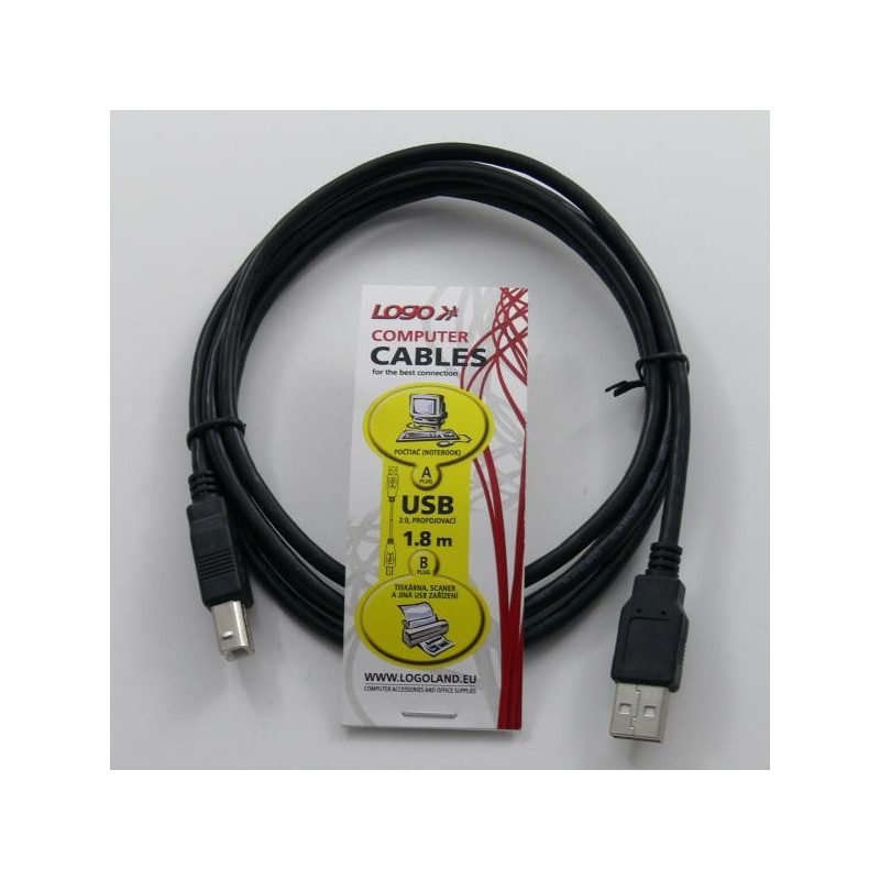 Kábel USB (2.0) - USB A M - USB B M - 1.8m, čierny, LOGOPrepojovací USB 2.0 kábel určený k prepojeniu bežných zariadení ako napríklad počítača s tlačiarňou (či skenerom alebo multifunkčným zariadením).