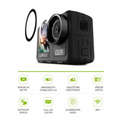 | Funkcia | Stabilizácia MAXsmooth 2.0, WiFi, spomalené video, zrýchlené video, automatický časozber, režim potápania, režim automobil, režim video + foto, slučka, korekcia rybieho oka, sériové foto, časovač, dlhá expozícia, cyklické nahrávanie, manuálne nastavenie expozície, nastavenie farieb vo videu, kreatívne režimy, šetrič obrazovky, formát NTSC/PAL, WDR, redukcia šumu, otočenie obrazu o 180 °, zvuk kláves, zvuk uzávierky, dátum a čas vo videu, automatické vypnutie, auto nahrávanie po zapnutí |