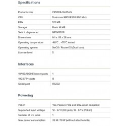 Cloud Router Switch CRS309-1G-8S+IN je operačním systémem SwOS či RouterOS poháněný 8-portový switch s osmi SFP+ šachtami a jedním management ethernet portem v desktop provedení.