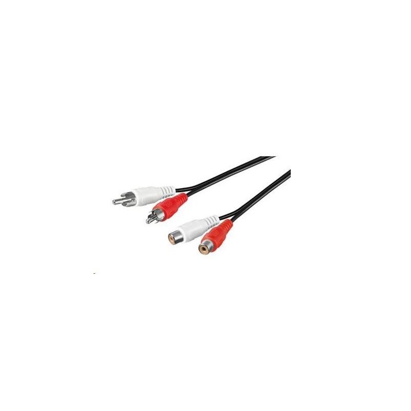 Kabel pro prodloužení spojení dvou audio zařízení zvukovým signálem stereo kvality. Na obou stranách jsou 2 konektory RCA (cinch). - Konektory: 2 x RCA cinch male <-> 2 x RCA cinch female - Barva konektorů: čená a červená - Barva: černá - Délka: 2m