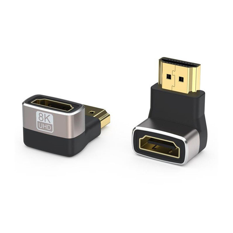 PremiumCord 8K Adaptér spojka HDMI A - HDMI A, F / M, zahnutá do pravého uhla 90°, HDMI adaptér slúži na zapojenie kábla do zariadenia pod uhlom 90 °, Podporuje rozlíšenie: 8K @ 60Hz, 4K @ 120Hz, FULL HD 1080p, Prenos signálu je stopercentne digitálny a bez akejkoľvek straty kvality. Konektory: HDMI female - HDMI male. HDMI prepojka vysokej kvality. Zastreknutá redukcia s hliníkovým puzdrom. Pozlátené konektory. Pozlátené kontakty. Farba: Space Grey. Balenie PVC sáčok s popisom a EAN čiarovým kódom