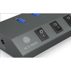 USB rozbočovač - 7x rozhranie USB 3.0 typu A. Hostiteľské rozhranieUSB 3.0 Type-C alebo Type-A až 5 Gbit/s. Všetky porty USB spĺňajú špecifikácie nabíjania batérie USB (BC 1.2) s výkonom až 7,5 W. Prepínač On/Off pre každý port. LED indikátor napájania na každom USB porte (možnosť externého napájania cez adaptér)