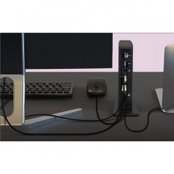 Dokovacia stanica pre notebooky - podporuje USB Type-C a USB Type-A prostredníctvom adaptéra, podporuje obrazovky HDMI a DisplayPort až 2x 4K pri 60 Hz, 6x USB 3.0 typu A až 5 Gbit/s, 3,5 mm kombinovaný konektor na pripojenie mikrofónu alebo náhlavnej súpravy, rozhranie RJ 45 Gigabit Ehernet pre rýchle a stabilné internetové pripojenie