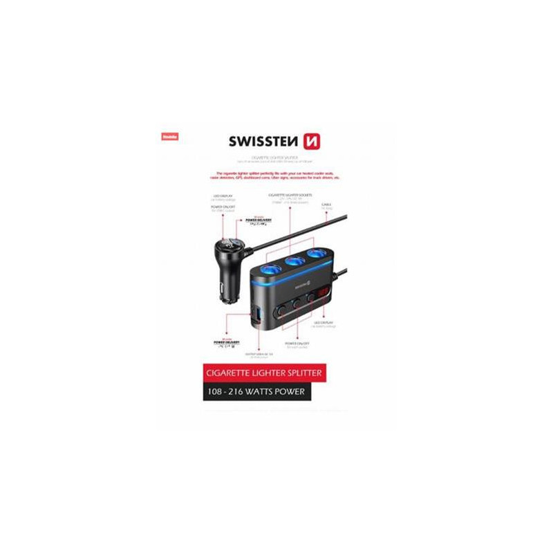 Swissten CL splitter má 3x výstup pro CL adaptér, 2x USB-C PD PPS, 1x USB-A QC 3.0 a celkový výkon 108-216W. Baleno v blistru SWISSTEN.