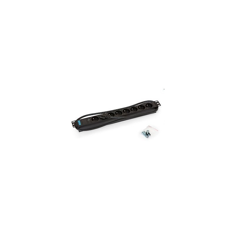19“ rozvodný panel 1U; 8 x zásuvka podle ČSN, max. 16 A; kabel 3 x 1,5 mm, 2 m + zástrčka univerzál CZ-DE max. 16 A; kontrolka, RAL 9005