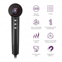 TrueLife HairDryer D9 patrí ku špičke vo svojej kategórii. Jeho ionizátor s technológiou TrueLife UltraIonic produkuje až 200 miliónov záporných iónov pre hladšie a zdravšie vlasy. Vlhkosť sa z dlhých a polodlhých vlasov odparí rýchlejšie a pri nižšej teplote. Šetrnosť a rýchlosť sušenia je tiež zásluhou motora s technológiou TrueLife UltraFlow, ktorý dosahuje až 110 000 otáčok za minútu. Praktickou výbavou fénu je okrúhly farebný LED displej, ktorý prehľadne zobrazuje všetky informácie o fúkaní, t. j. zvolený režim, rýchlosť alebo ionizáciu.