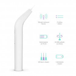 Tenká vibrujúca nylonová špička má na konci guličku, ktorá napomáha vytiahnuť šetrne zvyšky jedla z medzizubných priestorov.