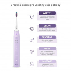 Stačí jeden kartáček na riešenie rôznych problémov. Balenie sonickej kefky TrueLife SonicBrush Clean70 UV zahŕňa 2 hlavice. Standard pre každodenné čistenie a Sensitive s extra jemnými štetinkami pre citlivé zuby. Dokúpiť možno aj hlavicu Whiten na bielenie zubov. Hlavice však nie sú jedinými pomocníkmi pri starostlivosti o zuby a ďasná, svoju prácu vykoná tiež 5 režimov čistenia. S bežným čistením si poradí režim Clean, o citlivé zuby a ďasná sa postará režim Sensitive, pre žiarivý lesk a odstraňovanie škvŕn od čaju a kávy použite režim Shine, o odstránenie odolného zubného plaku a vybelenie zubov sa stará režim Whiten, ak chcete zlepšiť zdravie ďasien a stimulovať ich, režim Massage je tou správnou voľbou.