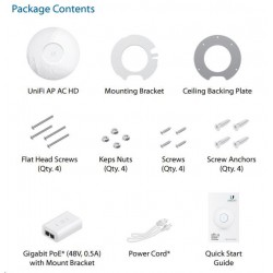 UniFi AP AC HD je první 802.11ac wave2 AP od Ubiquiti s celkovou propustností až 2533Mbps (2.4GHz 800Mbps + 5GHz 1733Mbps), Disponuje 4x4 MU-MIMO všesměrovými dvou-polarizačními dualband. 3dBi antény pro 2.4GHz a 4dBi pro 5GHz s výkonem rádiové části až 25dBm jak pro 2.4 tak i pro 5GHz současně. Podporuje standardy 802.11a/b/g/n/ac/ac wave2, disponuje dvěma gigabit.ethernet. porty (druhý je v bridgi). Lze napájet prostřednictvím aktnivního PoE dle 802.3at případně pasivního (48V DC), PoE adaptér je součástí balení (pasivní). Maximální spotřeba činní 17W.