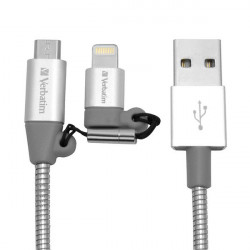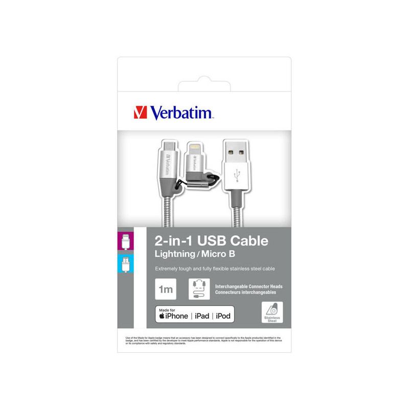 Synchronizačný a nabíjací kábel Verbatim 2 v 1 umožňuje nabíjať a prenášať dáta pre zariadenie Apple a zariadenia s konektorom USB Micro B jedným káblom. Vynikajúci na cesty, pretože vďaka výmennému konektoru nie sú potrebné dva káble.